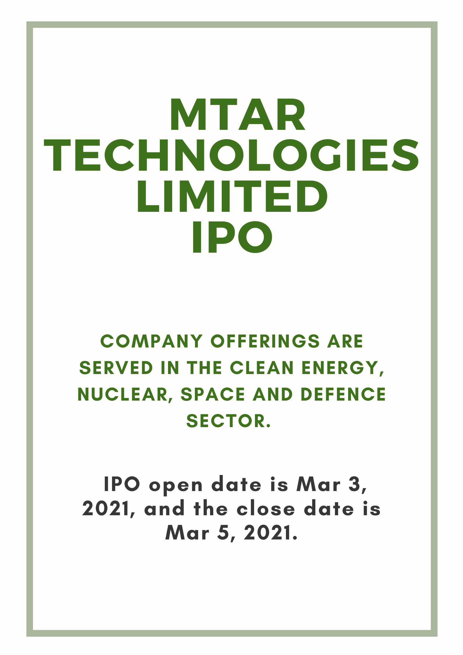 The mtar technologies limited ipo is a main board ipo for the issue of 10,372,419 equity shares having the face value of rs.10 totaling up to rs.596.41 crores. Through the issue, the company aims to accumulate a sum of rs. The issue will close on march 5. Mtar technologies, a precision engineering solutions company, is set to launch its initial public offering (ipo) for subscription on march 3, 2021. Mtar technologies, a leading national player in the precision engineering industry, will open its initial public offering (ipo) for subscription on march 3.